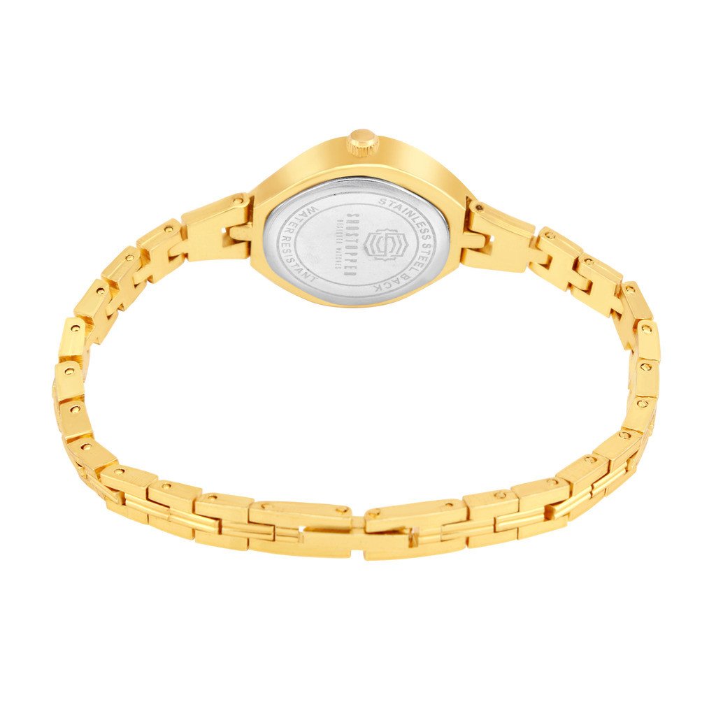 Description: Shostopper Designer Gold Dial Analogue Watch for Women - SJ62069WW . This brand is one of the most prominent imported brands in providing high profile and luxurious watches for people who love to flaunt their style. This watch features a sturdy case with an easy to wear Golden Metal strap that will appeal you instantly. Crafted from superior quality material, it is extremely durable and comfortable to wear throughout.Its Assymetrical dial is encased in an antique-looking and features the Japanese movement mechanism.Please ensure the stopper is removed and crown is fully pressed to make the watch functional.In the Box 1 Watch .