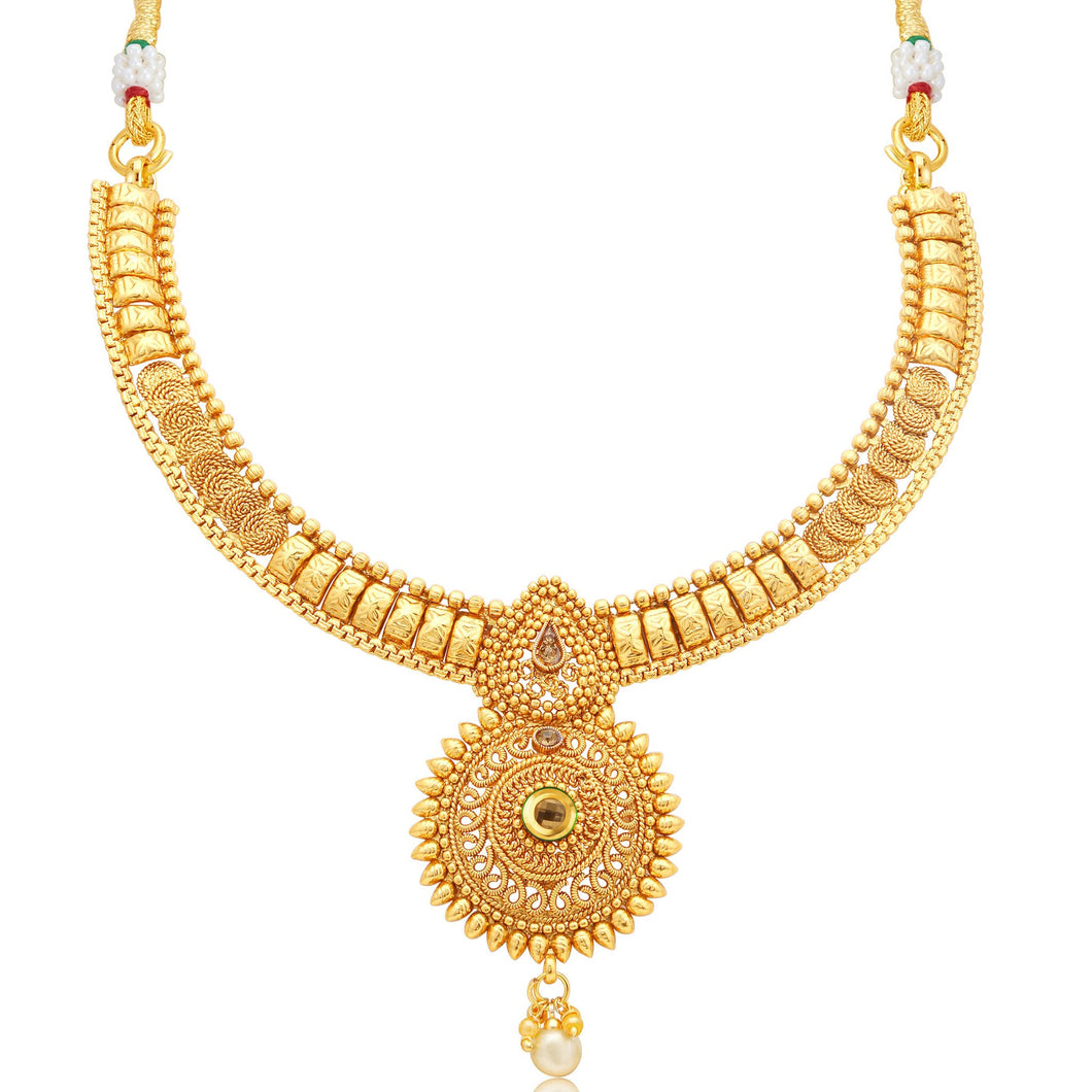 Brand: Sukkhi Product Type: Necklace Set SKU: N71641GLDPR2050 Colour: Gold Material: Alloy Plating: Gold Plated Stone Used: NA Design: CAD/CAM Dimension: Necklace L: 8.5 cm B: 12 cm||Earring L: 6.5 cm B: 4 cm Weight: 50 gms Shipping TAT: 3-5 days Description: This Sukkhi Alluring Jalebi Gold Plated LCT Stone Collar Necklace Set For Women is made of Alloy. Women love jewellery; specially traditional jewellery adore a women. They wear it on different occasion. They have special importance on ring ceremony, wedding and festive time. They can also wear it on regular basics. Make your moment memorable with this range. This jewel set features a unique one of a kind traditional embellish with antic finish. Care label: Avoid of contact with water and organic chemicals i.e. perfume sprays. Avoid using velvet boxes, and pack them in airtight boxes. After use , wipe the jewellery with soft cotton cloth. Note: The image has been enlarge for better viewing. Disclaimer: Product colour may slightly very due to photographic lighting source or your monitor settings.