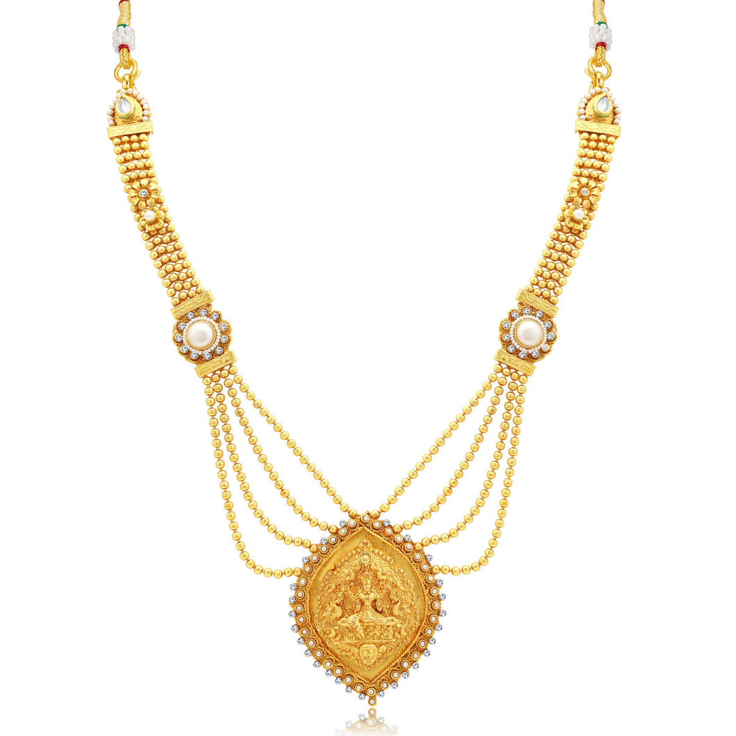 Description: This Sukkhi Attractive Laxmi Temple Gold Plated AD Long Haram Necklace Set For Women is made of Alloy. Women love jewellery; specially traditional jewellery adore a women. They wear it on different occasion. They have special importance on ring ceremony, wedding and festive time. They can also wear it on regular basics. Make your moment memorable with this range. This jewel set features a unique one of a kind traditional embellish with antic finish.