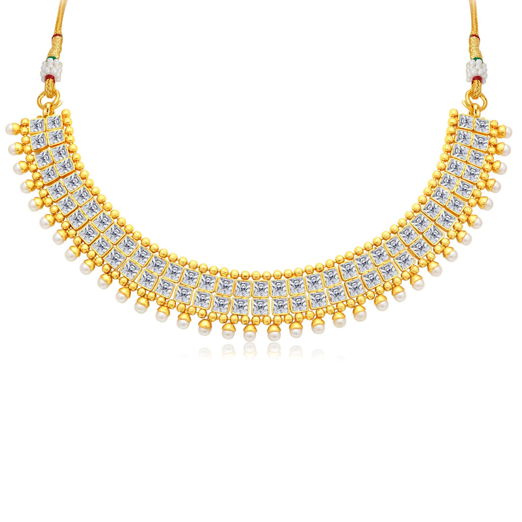 Description: This Sukkhi Glittery Gold Plated AD Collar Necklace Set For Women is made of Alloy. Women love jewellery; specially traditional jewellery adore a women. They wear it on different occasion. They have special importance on ring ceremony, wedding and festive time. They can also wear it on regular basics. Make your moment memorable with this range. This jewel set features a unique one of a kind traditional embellish with antic finish.